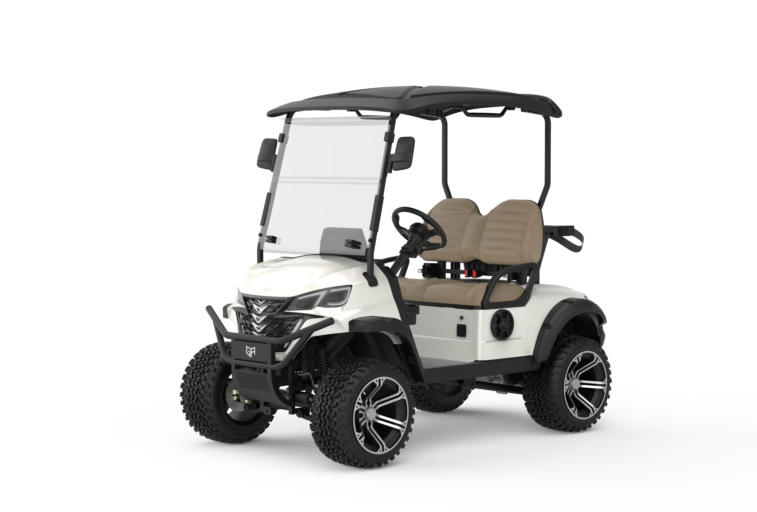 The KC-G2H is a premium off-road electric golf cart built for versatility and strength. With its raised chassis, rugged all-terrain tires, and durable front guard, it’s engineered to handle rough paths while maintaining a smooth, stable ride. The elegant white body paired with beige ergonomic seats gives it a refined and professional appearance. Combining power, comfort, and quiet operation, the KC-G2H is ideal for golf courses, resorts, farms, and leisure estates.